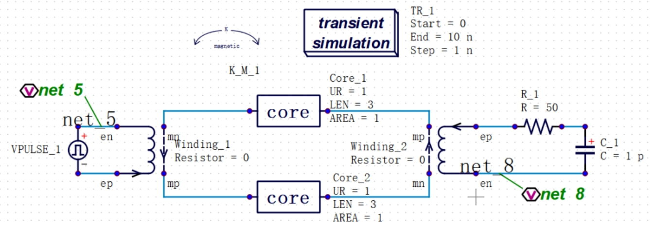 The iron cores and winding materials of different transformers vary greatly. Julin Technology's PowerExpert supports simple and flexible custom transformer construction. Custom transformers can be built using winding, core or non-linear core, and winding binding (K_Magnatic) devices. The ideal magnetic core supports setting magnetic permeability, cross-sectional area and length, while the nonlinear magnetic core supports setting shape parameters, magnetic domain wall bending constant, hysteresis loss coefficient, saturation magnetization intensity and other coefficients. The magnetic core and winding are set to belong to the same transformer through winding binding devices.